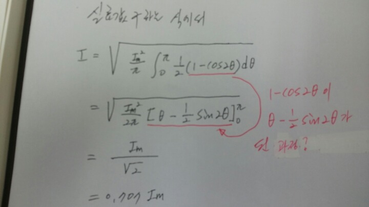 실효값 공식유도 질문 작성자프로정신|작성시간16.03.07|조회수820 목록 댓글 3 글자크기 작게가 글자크기 크게가 아래 첨부 된 실효값 공식 유도과정 일부가 이해가 안됩니다.고수님들 부탁드립니다. 다음검색 현재 게시글 추가 기능 열기 북마크 공유하기 신고 센터로 신고 댓글 댓글 3 댓글쓰기 답글쓰기 댓글 리스트 작성자재끄 | 작성시간 16.03.07 원래 있던 1/2은 앞으로 나가고 θ에 대한 적분이네요 작성자프로정신 작성자 본인 여부 작성자 | 작성시간 16.03.07 풀이식 좀 부탁드립니다. 답댓글 작성자프로정신 작성자 본인 여부 작성자 | 작성시간 16.03.07 햩타 정말 감사합니다. 댓글 전체보기