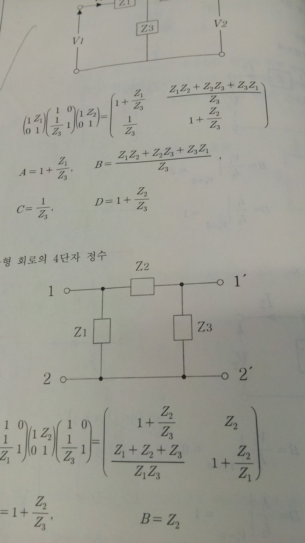 그러니까 행렬로 계산하는게 아니고 T형회로의 4단자정수 B = Z1*Z2+Z2*Z3+Z1*Z3 / Z3 공식을