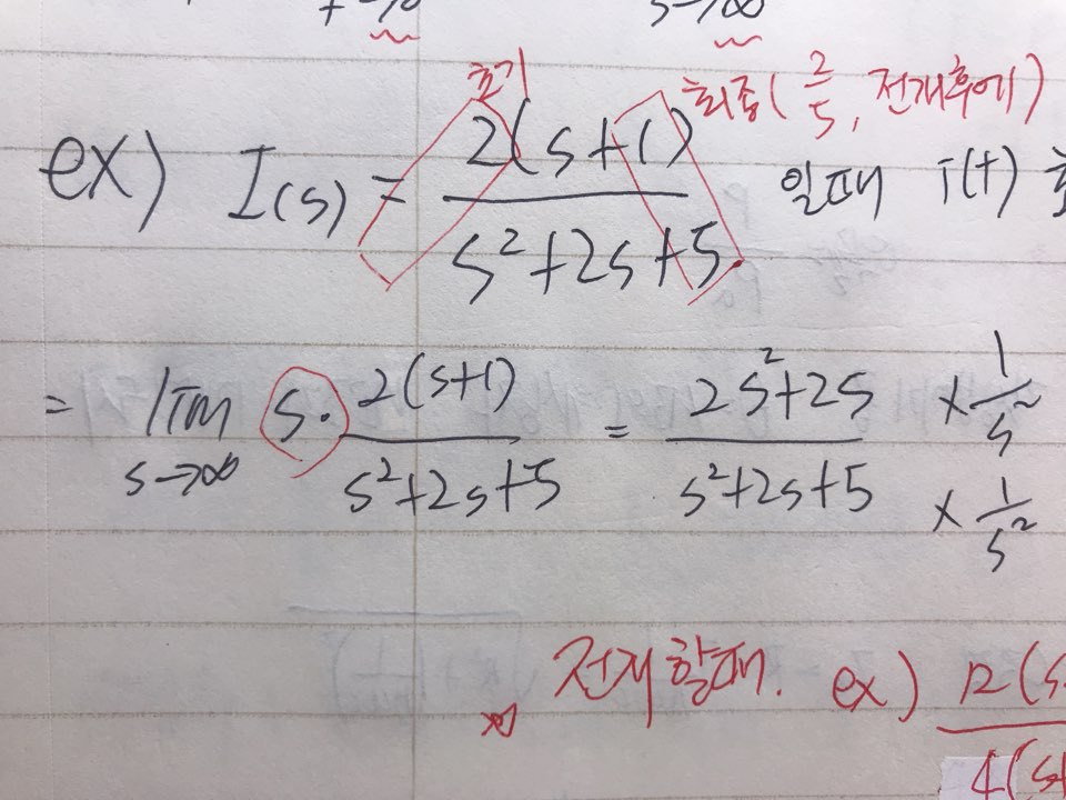 라플라스변환 파트에 초기값정리 작성자합격하러왔수다|작성시간18.09.24|조회수777 목록 댓글 1 글자크기 작게가 글자크기 크게가 가운데 식에서요 왜 분자분모에 1/s제곱 을 곱해줘야 하는건가요이유를 알고싶습니다. 다른식에서도 응용할려면 이유를 알아야할것같아요 다음검색 현재 게시글 추가 기능 열기 북마크 공유하기 신고 센터로 신고 댓글 댓글 1 댓글쓰기 답글쓰기 댓글 리스트 작성자워니원 | 작성시간 18.09.25 (2+2/s) / (1+2/s+5/s^2)에서 분모에 에스가 들어간 부분들은 s->inf 때문에 0이돼요그래서 최고 차항의 차수만큼 나눠주는거에요 댓글 전체보기