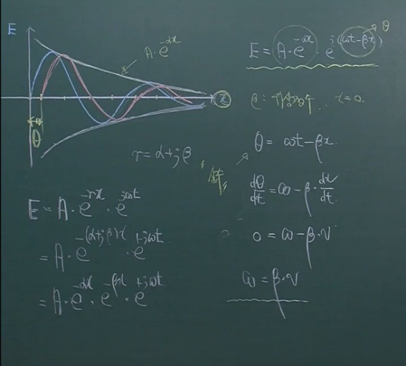 질문1. x축으로 세타만큼 평행이동했는데 왜 위 식처럼쓰이는지 잘 이해가되지않습니다. E=Ae^-알파(x-세타) e^j{wt-베타(x-세타)}가 되어야 하는것이 아닌가요?