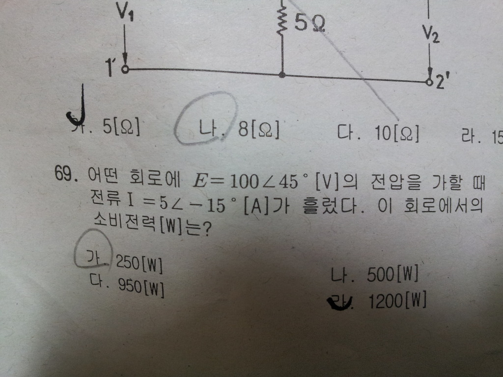 이므로 켤레복소수(E) = 100(cos45-jsin45) 와 I = 5(cos(-15)+jsin(-15))를 곱하게 되면 피상전력은 251-j434.81입니다
