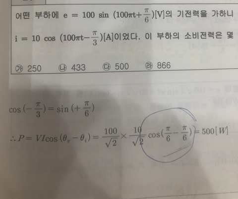 전력을 구하는데 V와 I가 하나는 사인파, 또하나는 코사인파인데 공식은 VI 코사인세타인데