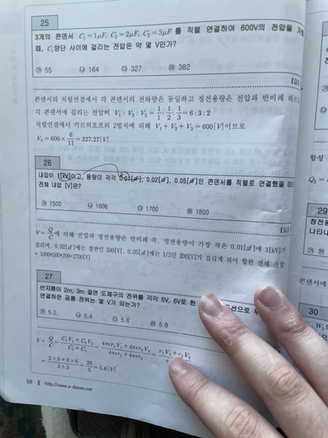 26번문제를 보면 여기서 정전용량이 잴 작은 0.01uF을 기준으로 0.01에 1000v걸린다 생각하고 0.02 랑 0.05uf에 걸리는 내압 계산해준부분인데, 여기서 제가 궁금한점은 기준 커패시터를 0.01로 한이유가 정전용량이 가장 작아서인지 혹은 정전용량 * 내압의 곱이 가장작아서 콘덴서가 가장 빨리 파괴 되어서 그런지 궁금합니다 예를 들어 0.01 0.02 0.05 uF이 각각있고 전압이 700 100 200이 걸려있더라면 0.02F이 기준이 되어야하는지 0.01이기준이 되어야하는지 궁금합니다 ㅠ