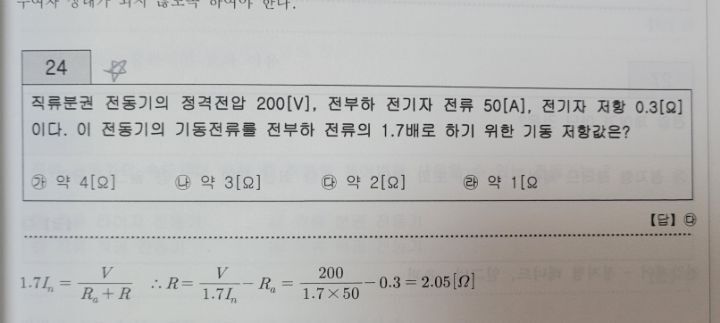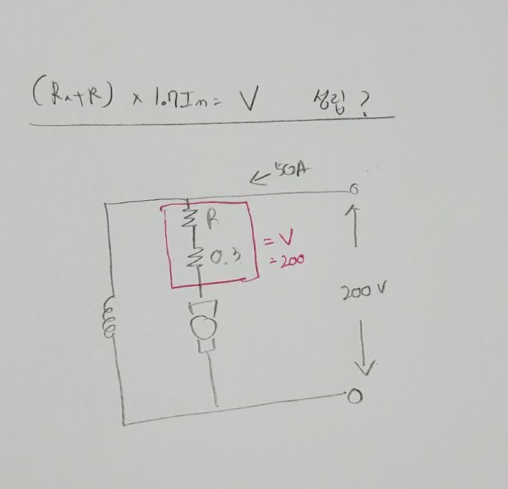 1. 기동 저항값이 없을때, 전부하 전기자 전류 50A 와 전기자 저항 0.3ohm 을 곱했을 때는 15V가 된다.