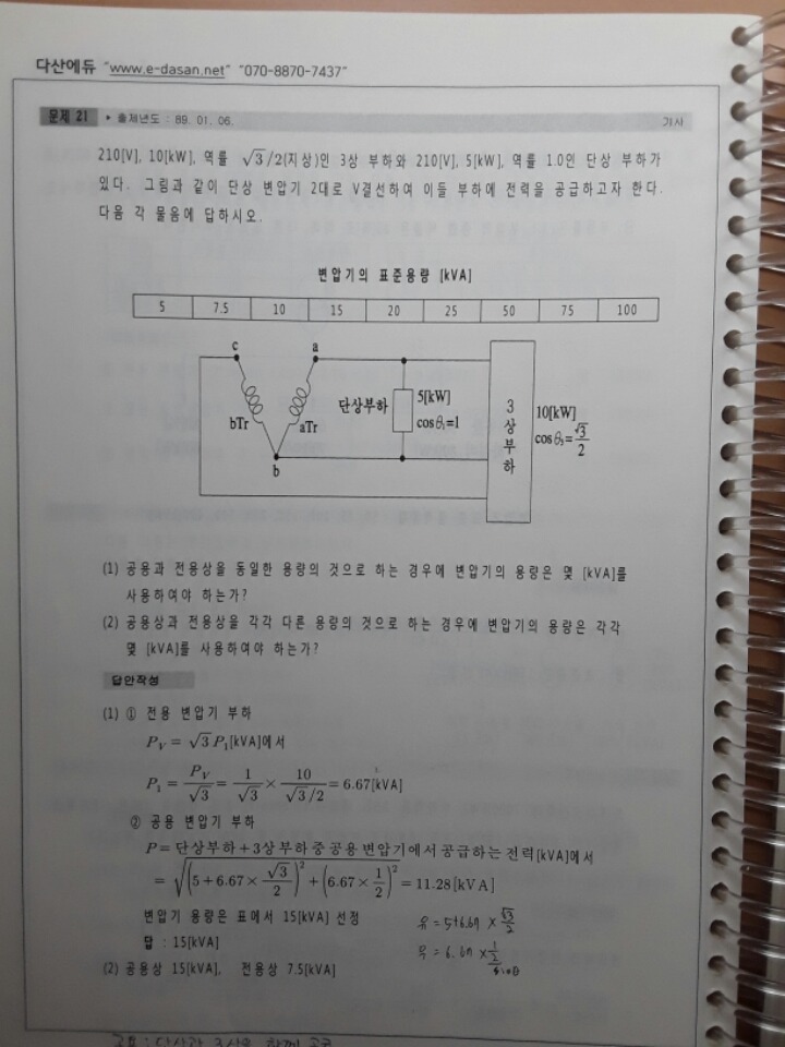공용변압기는 단상부하 3상부하 동시에 운전하려할때 변압기용량을 구하는겁니다. 즉 3상을 운전하기위한 앞서구했던 전용변압기 용량과 단상부하용량이 역률이 다르므로 최종적으로 저리해준거죠. -
