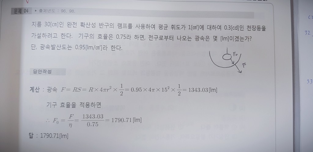 이 문제에서 광속발산도에 의한 광속은 반구의 램프 면적을 이용해서 구했으니 조명램프의 의한 광속이고