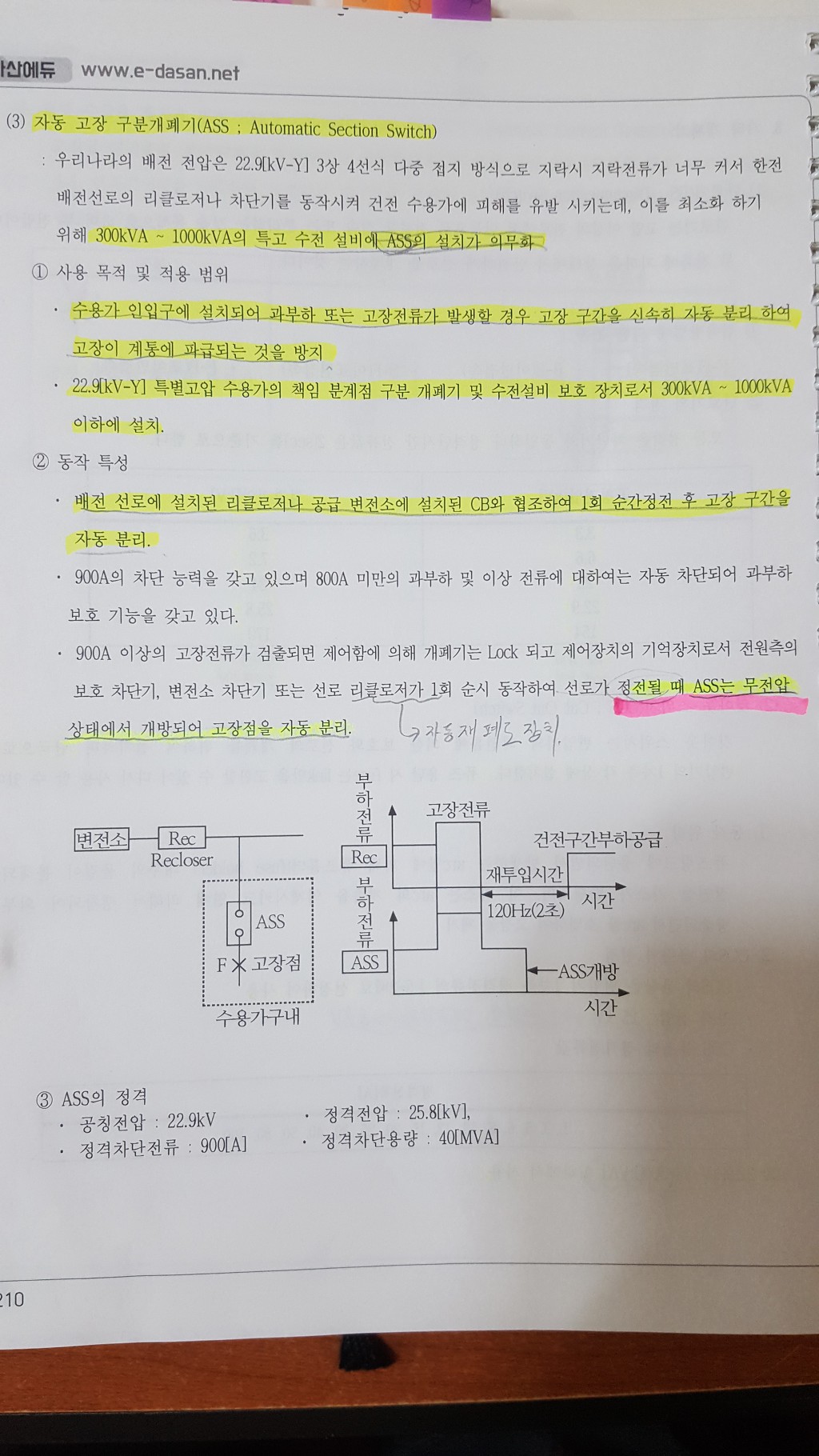 고장전류를 감지한 한전측 특고압 선로가 순간정전(0.5초 정도)으로 무전압일때 ASS가 이 때 개방됩니다.