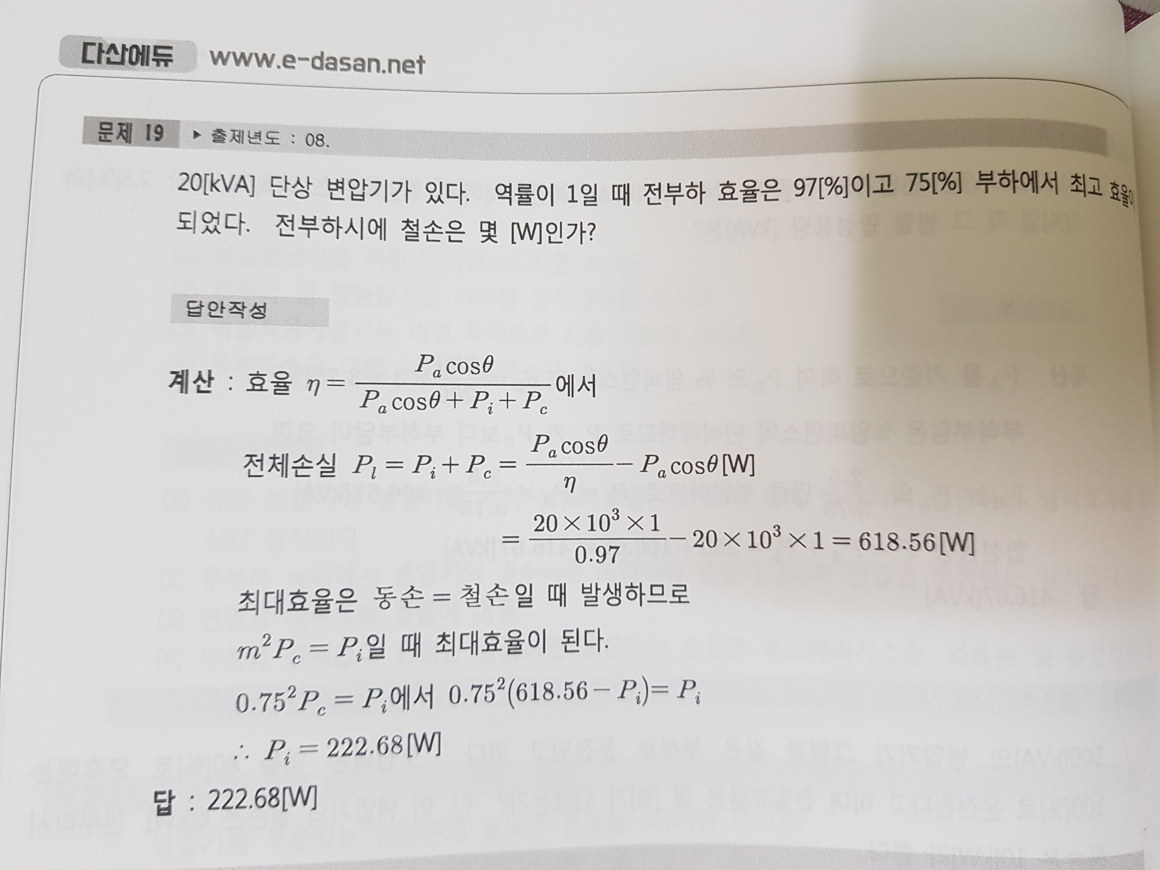 풀이보니까 출력=20kVA로 놓고 풀던데 그러면