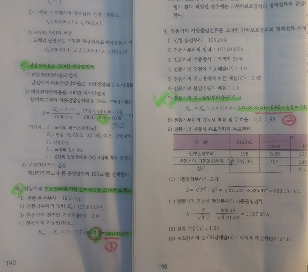 1) 전동기의 기동전류에 의한 온도상승을 고려한 도체의 단면적 선정 P190