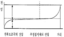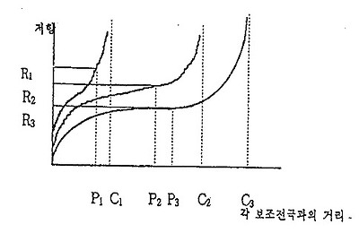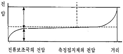 이 측정방법은 그림 4.1의 회로처럼 측정접지체(E)에서 전류보조극(C)을 멀리 설치하고, E와 C를 잇는 직선상에서 전압보조극(P)를 이동시키면서 그림 4.2의 거리별 저항분포곡선을 그린다. 저항(전압)분포곡선상에서 수평부분을 이루는 부분에서의 측정결과가 접지저항값으로 결정된다. 만일 수평부분이 없다면 전류보조극을 좀더 멀리설치하고 측정을 다시 설치하여야 한다. 이 측정방법을 사용할 때의 주의할 사항으로는 전류보조극을 접지체로부터 멀리 설치해야 한다는 것과 측정방향으로 도전성 매설물이 있을 경우에는 오차가 크게 발생할 수 있으므로 측정방향을 선정하는데 있어 신중해야 할 것이다. 이때 측정접지체는 관련 접지대상(즉, 접지체가 사용되는 시스템 및 본딩 된 타 접지시설과)과는 반드시 분리해야 한다.