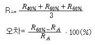 O 접지체 크기의 2배 이상으로 C극과의 거리를 설정, P극의 위치는 접지체와 C극간 거리의 40%, 50%, 60%되는 지점으로 이동하면서 각 접지저항 R40%, R50%, R60%을 측정한 뒤, 다음식에 의해 계산된 오차가 5%이내일 경우 평균값인 RA를 접지저항값으로 간주한다.