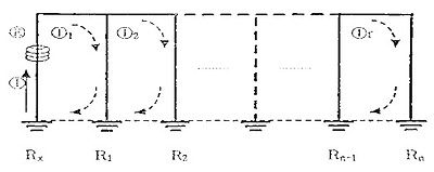 MGN(MultiGrounding Neutral) 전력시스템이나 통신케이블의 경우처럼 다중 접지된 시스템의 경우 (그림 4.4)와 같은 회로로 모델링 될 수 있다. 이 때 특수한 변류기를 사용하여 회로에 전압 E를 공급해 주면 전류 I가 흐르게 된다. 다시 변류기를 사용하여 흐르는 전류를 측정할 때 전류와 전압과의 관계는 다음과 같이 나타난다.