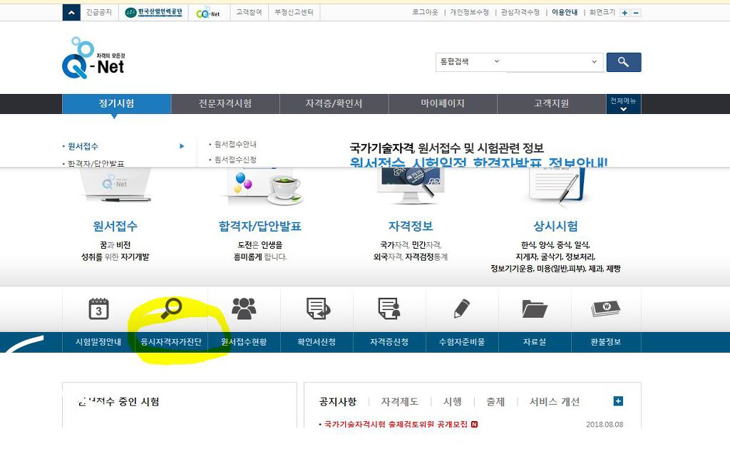 1. 큐넷에 접속해 왼쪽에 있는 응시자격자가진단을 클릭