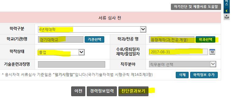 3. 위 노란색으로 칠해져 있는 부분 다 입력한 후 진단결과보기 클릭