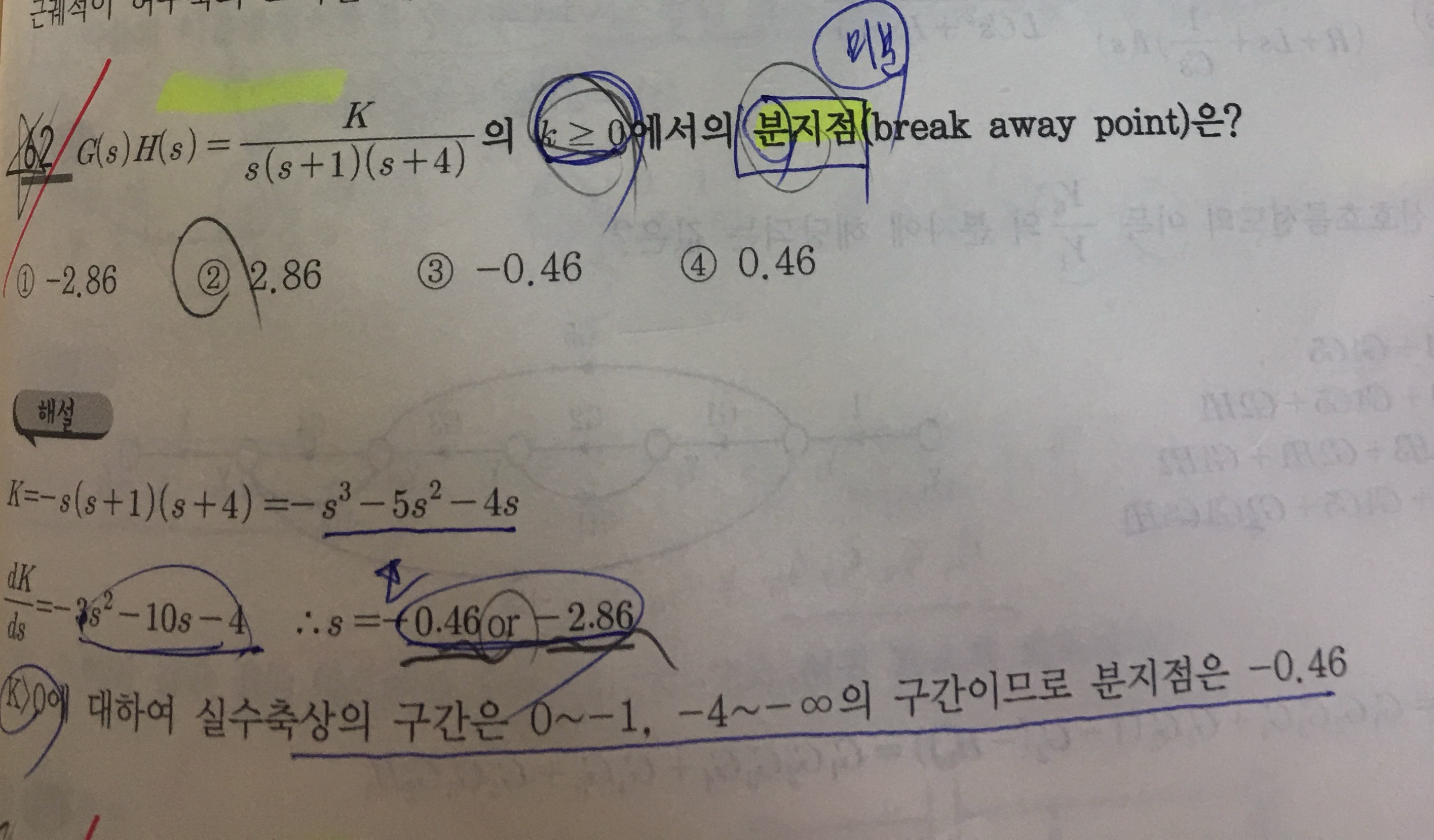 분지점 작성자베이비몽몽|작성시간19.02.16|조회수1,662 목록 댓글 2 글자크기 작게가 글자크기 크게가 마지막 해설부분 잘 이해가 안 되서요..K > 0 에 대해서 실수축상의 구간은 0~-1, -4~ -무한대 구간이다저 구간이 어떻게 나오는거죠?? 다음검색 현재 게시글 추가 기능 열기 북마크 공유하기 신고 센터로 신고 댓글 댓글 2 댓글쓰기 답글쓰기 댓글 리스트 작성자전력왕 김정전 | 작성시간 19.02.16 문제에서 s(s+1)(s+4) 에서 s=0 , -1 , -4 가 나오잖아요.실수축상의 구간은 홀수측에 존재합니다.0~-1이고 -1~-4는 안되고요(짝수) -4~-무한대 이 구간에 존재합니다. 답댓글 작성자베이비몽몽 작성자 본인 여부 작성자 | 작성시간 19.02.16 답변 감사드립니다! 댓글 전체보기