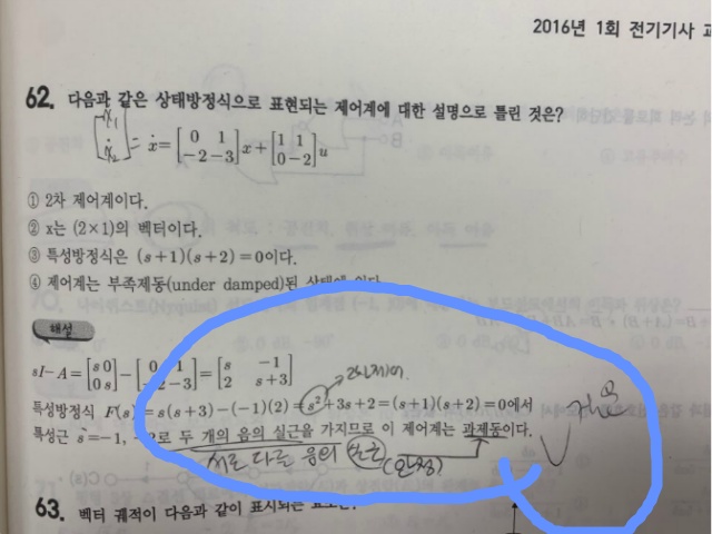 2016년 1회 회로이론 질문입니당!! 작성자뽀료롱|작성시간19.09.29|조회수924 목록 댓글 1 글자크기 작게가 글자크기 크게가 ]]1회 회로 62번 질문인데요과제동이라는게...그냥 음의 개수가 2개여서 인가요..?과제동에서 >1 이거요..1이..개수가 아니라..상수 아닌가요?? 다음검색 현재 게시글 추가 기능 열기 북마크 공유하기 신고 센터로 신고 댓글 댓글 1 댓글쓰기 답글쓰기 댓글 리스트 작성자사시랑이 | 작성시간 19.09.30 안녕하세요...답변드립니다. 2차 방정식이므로 근의 갯수가 2개이며, 근이 모두 음수이면 과제동, 음의 중근이면 임계제동, 음의 허근이면 부족제동입니다. 제동비가 주어지면 이 값이 1보다 크거나 작은 것으로 판단할수 있으나 이 문제에서는 근을 통해 파악한 것입니다. 댓글 전체보기