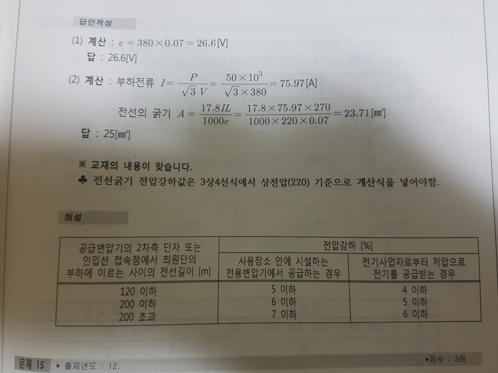 3상 4선식 전선굵기 계산 시 전압강하는 상전압 기준으로 계산한다고 공부했는데요