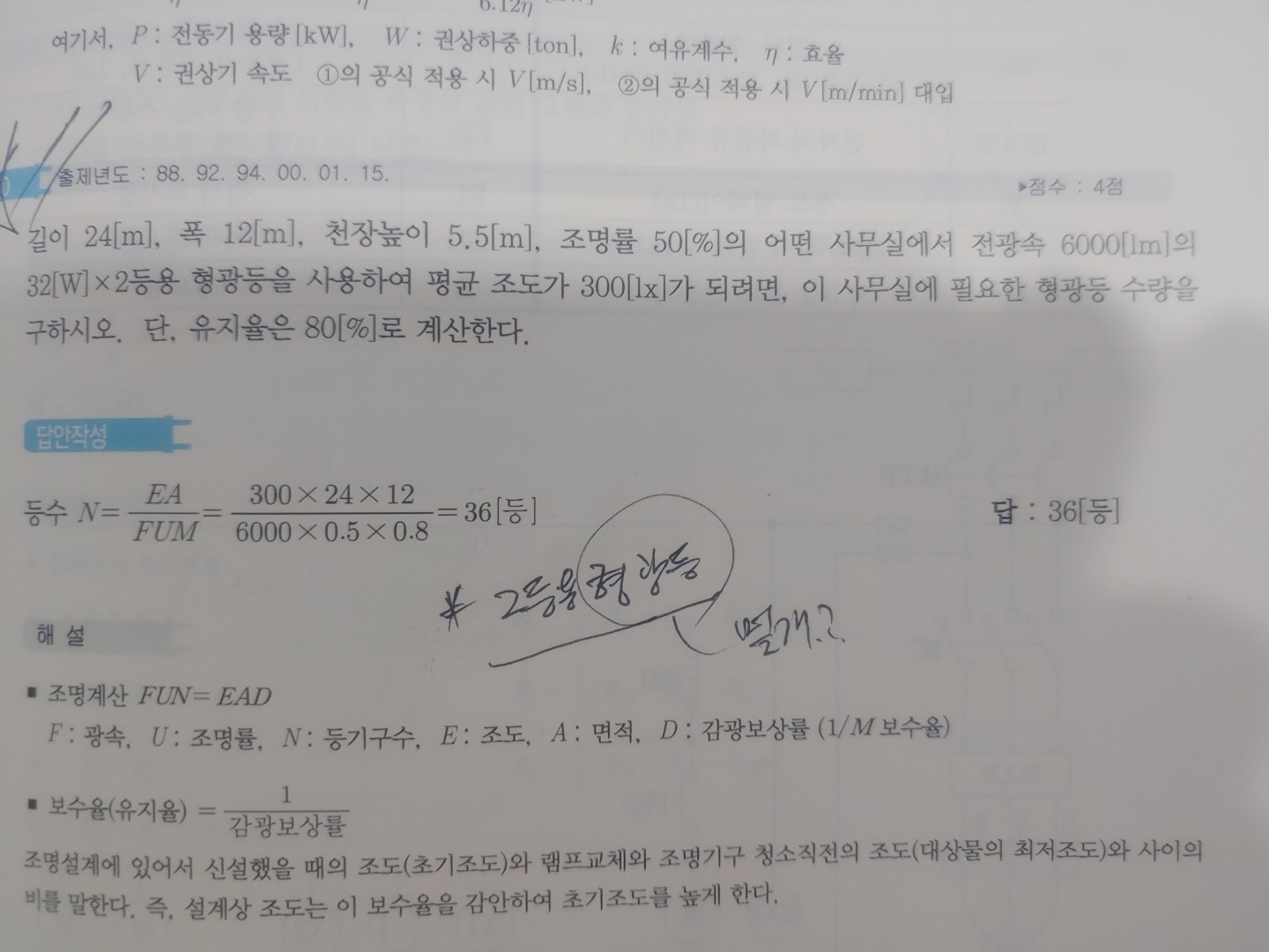 그런데 문제에선 등기구수를 구하라는게 아니라 형광등수를 구하라고 했으니72개가 답이 되어야하는게 아닐까요