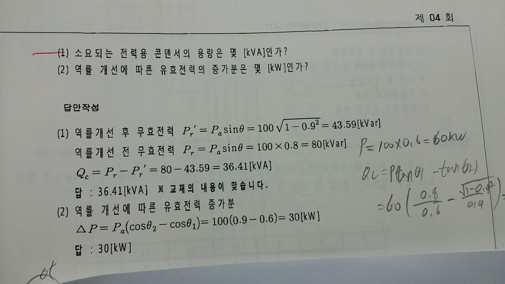 작성자보드빡셔 작성시간 17.04.09 이문제는 그냥 피상전력은 불변이라는 조건으로 역률 개선에 따른 무효분 변화만 계산하믄 되요