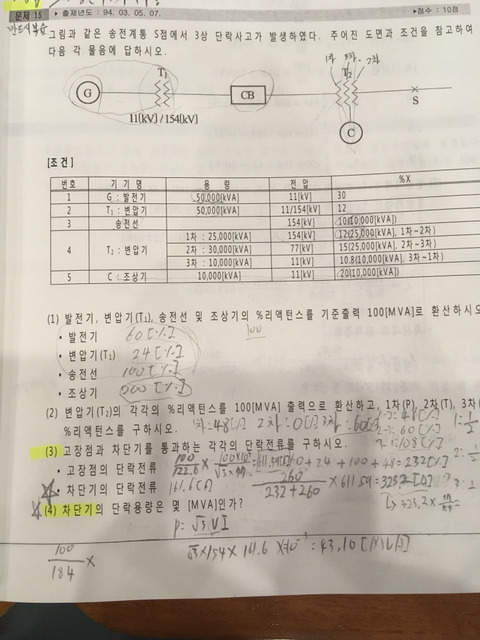 이문제에서 (3) 고장점 단락전류 계산할때 3차 변압기랑 조상기 %x 를 왜 합해서 병렬을 하는건가요? 조상기면 콘덴서로 작용하니까 퍼센트 리엑턴스를 빼주고 병렬 계산해야될꺼같은데..