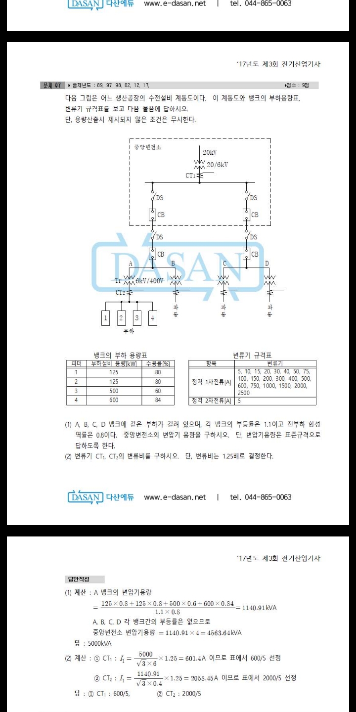 [산업기사]ct 변류비 구할때 P값은 어떻게 해야하나요? 작성자kimtaehyun|작성시간19.04.01|조회수663 목록 댓글 2 글자크기 작게가 글자크기 크게가 표준용량이란 말이 없는데 ct1 값에 5000을 쓰네요ct2는 안쓰는데 다음검색 현재 게시글 추가 기능 열기 북마크 공유하기 신고 센터로 신고 댓글 댓글 2 댓글쓰기 답글쓰기 댓글 리스트 작성자정진하자 | 작성시간 19.04.01 ct1은 중앙변전소 변압기측에 있어 중앙변전소 변압기용량을 표준용량으로 구하라햇으니 표준용량 5000대입하시면 되고ct2는 a뱅크에 잇으므로 1번에서 푼값 1140.91값을 대입하시면될것같습니다 답댓글 작성자kimtaehyun 작성자 본인 여부 작성자 | 작성시간 19.04.01 네 알겠습니다. 문제에서 표준용량이란 말을 정확하게 말해주면 이런 혼동은 없을텐데 ㅜ 아쉽네요 댓글 전체보기