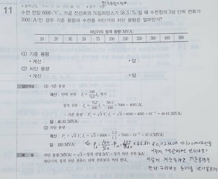 왜 루트3 차단기정격전압 정격차단전류로 구하는지 모르겠습니다. 하물며 답이 달라요.