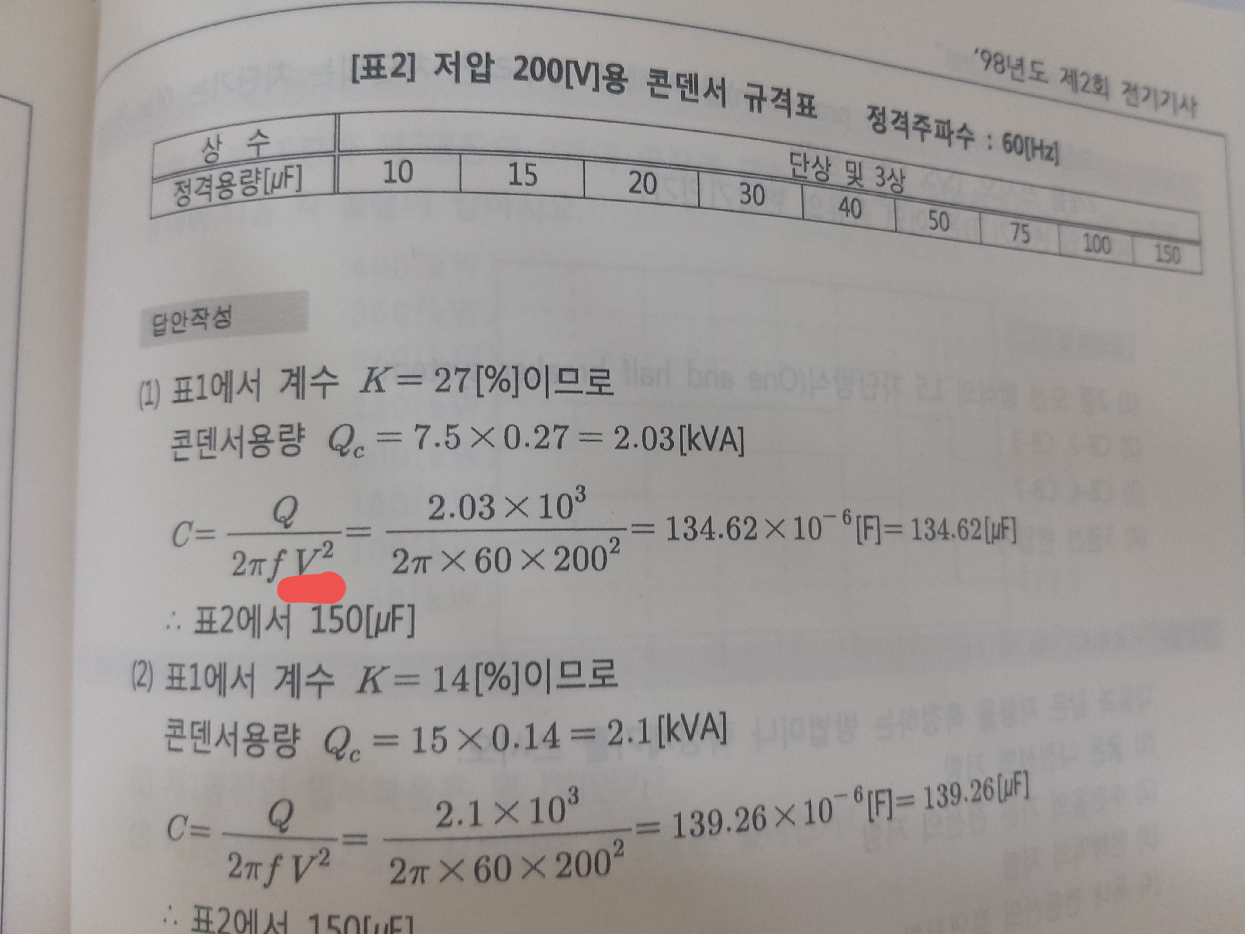 Q = wCE^2이라고 하시고 문제에서 주어진 정격전압 200V를 E에 대입해서 풀이해주셨고