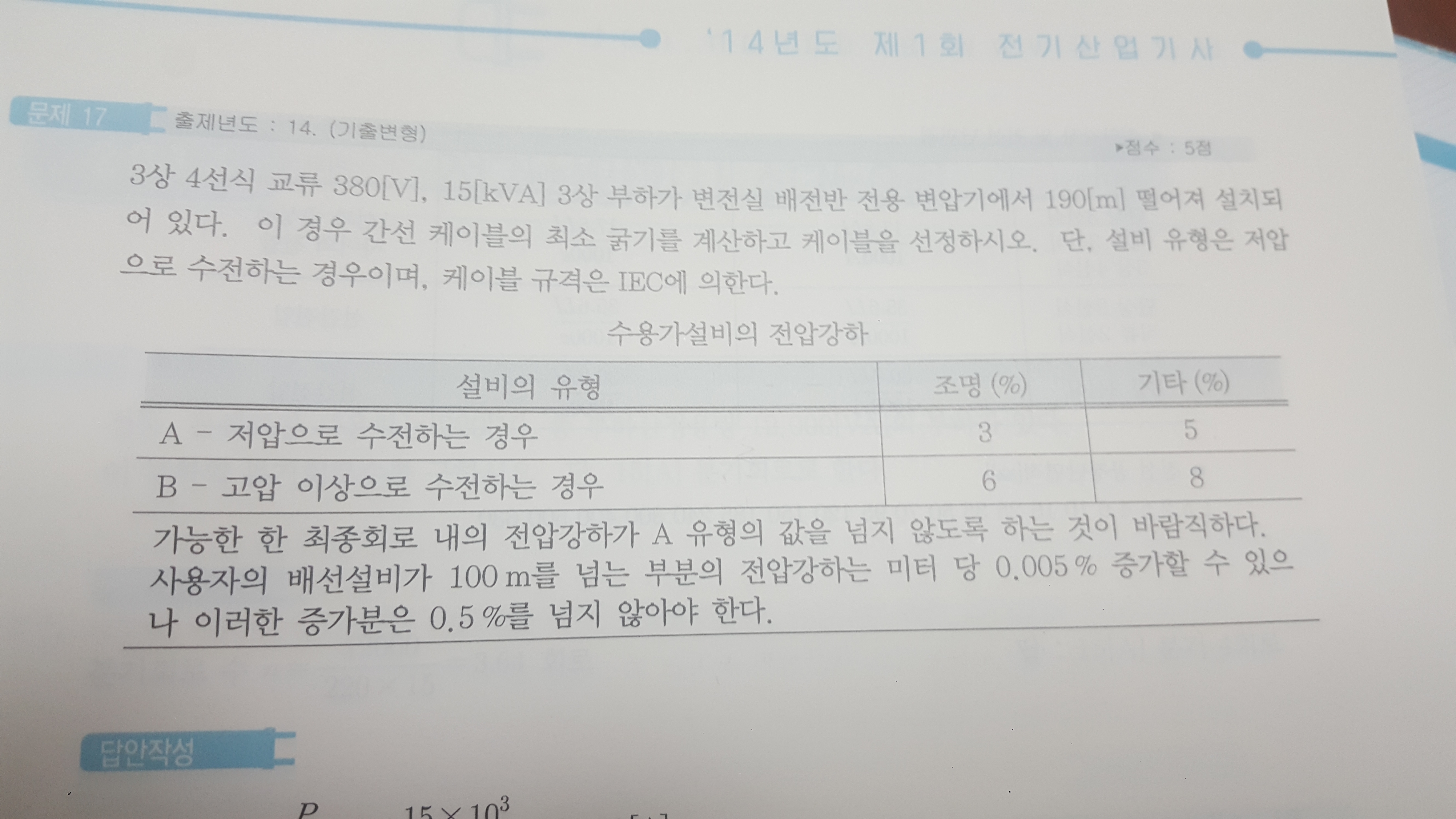 특히 35.6 17.8 30.8 전선의단면적 구하면서 100m 초과되면 0.005%씩 증가니 뭐니 한다고 해서 집중적으로 본 해설과 문제들이었음