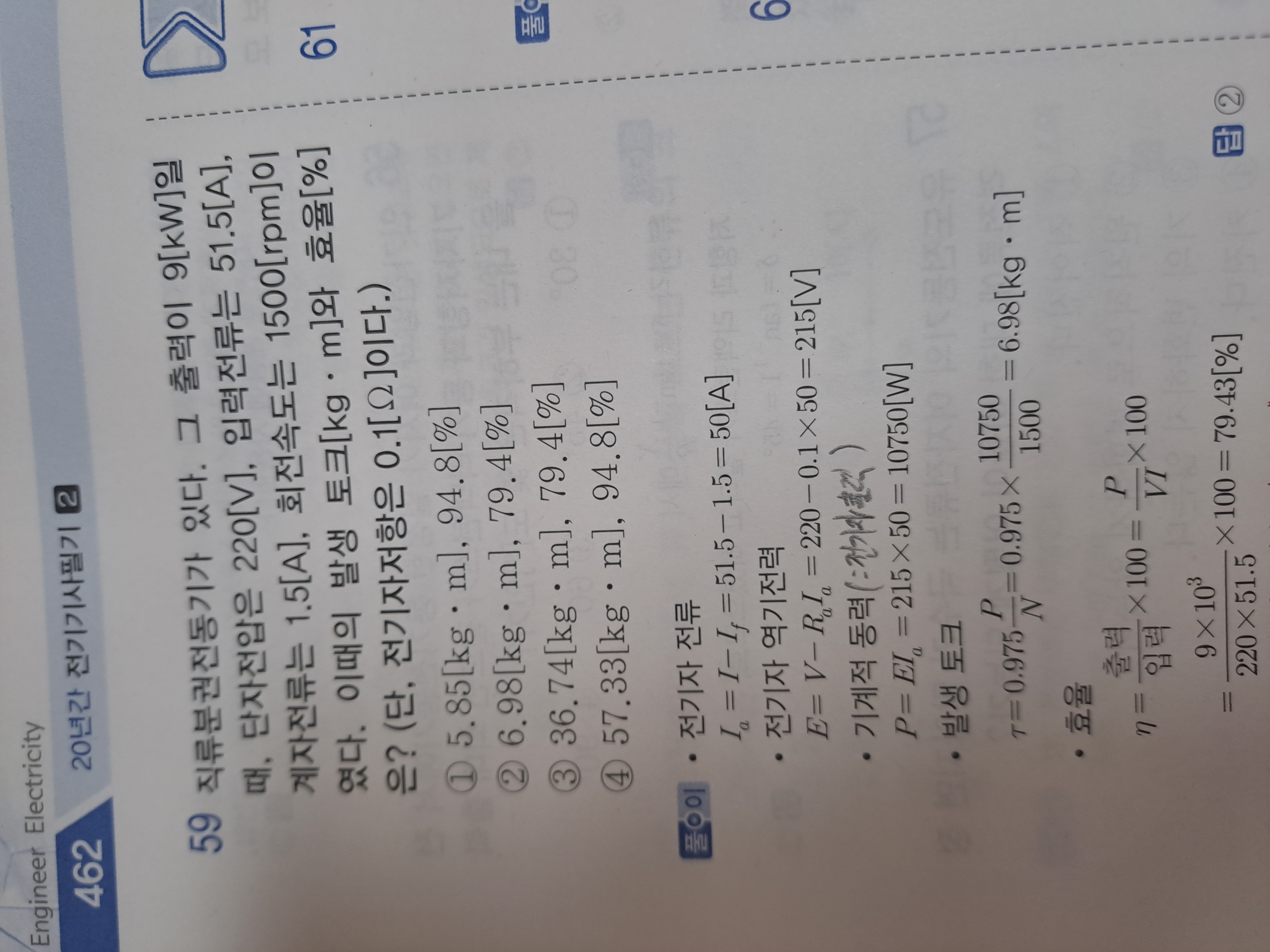 59번 문제로 이해하기로는 기계적동력이 전기자에서의 출력이고, 주어진 출력 9kW는 기계적동력에서 손실을 뺀 최종출력(부하에 가해지는 출력)이므로, 토크식에는 기계적동력을 넣어야 되는 것으로 이해했습니다.