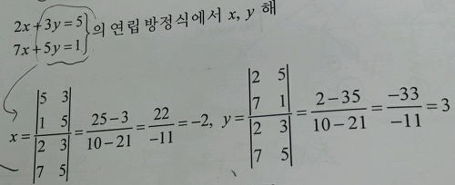 크래머 법칙을 이용해서 연립방정식 풀이를 보고 있는데요.
