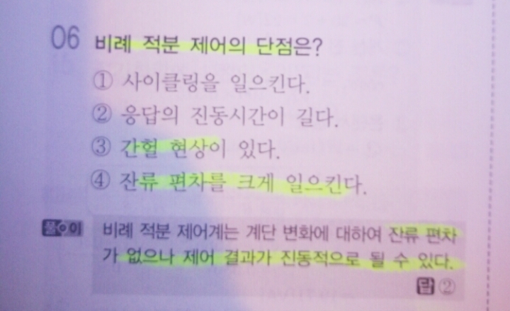 PI제어 단점질문입니다 작성자기사기사화이링|작성시간19.12.20|조회수2,452 목록 댓글 1 글자크기 작게가 글자크기 크게가 정답이 2번인데 제가알기론 간헐현상도 있는걸로알고있는데 3번도 답이되지않을까요 다음검색 현재 게시글 추가 기능 열기 북마크 공유하기 신고 센터로 신고 댓글 댓글 1 댓글쓰기 답글쓰기 댓글 리스트 작성자시나브로^^ | 작성시간 19.12.20 간헐현상이랑 사이클링을 뜻합니다.간헐현상의 경우 불연속제어에서 발생합니다.P, I, D, PI, PD, PID 제어는 연속제어입니다.PI 제어1. 잔류편차 제거2. 제어결과가 진동적으로 될 수 있다. 댓글 전체보기