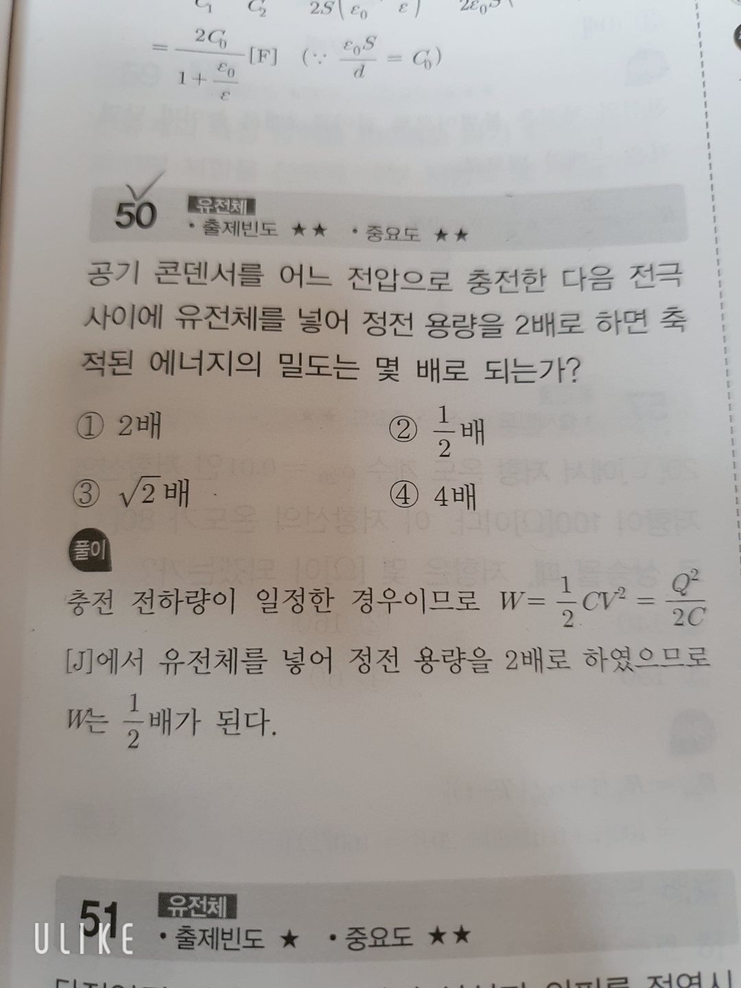 이 문제에서 왜 W=1/2C(V^2)이 아니라 (Q^2)/2C로 해서 1/2배가 되는건가요..?