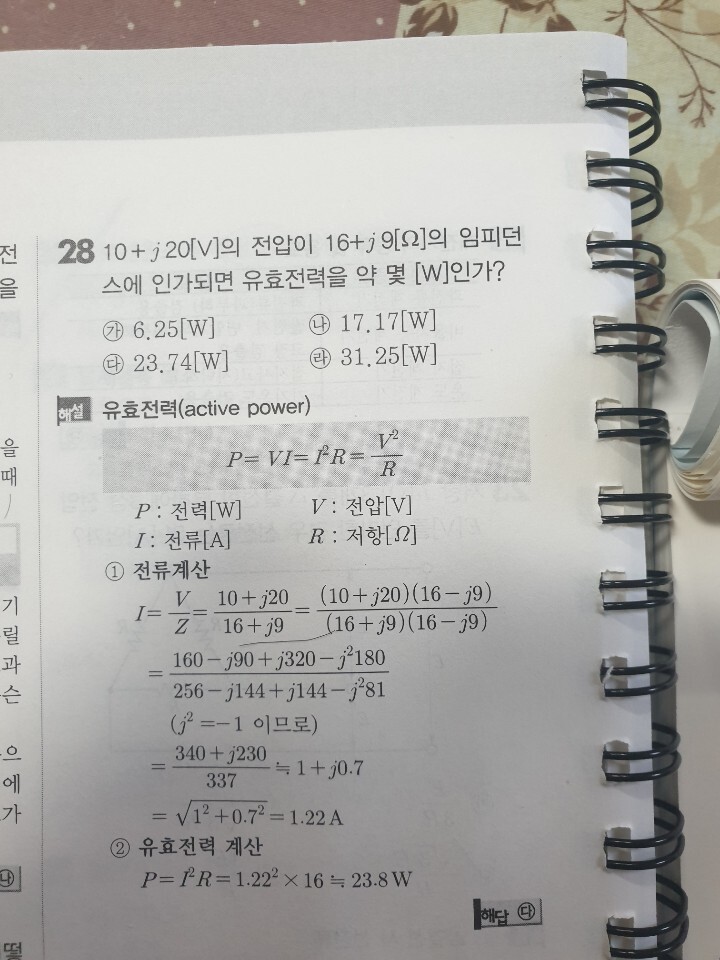 R분의 V제곱으로 계산하려고 하니 답이 안나옵니다 임피던스의 실수부는 저항이고 복소전압의 크기는 루트안에 넣고 제곱제곱 한것으로 구한다음에 R분의 V제곱식으로 구하면 왜 답이 안나올까요??