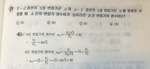 따라서 A군일때의 권수비는 최종적으로 1차측 전압이 2차측보다 루뜨 3배 크므로 권수비는 루뜨 3이고 문제에 제시된 A군 변압기 권수비 30을 곱해주고