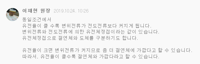 3. 교류의 측면에서 보았을 때 유전율이 높으면 변위전류가 커지므로 절연이 되지 않는 것입니다.