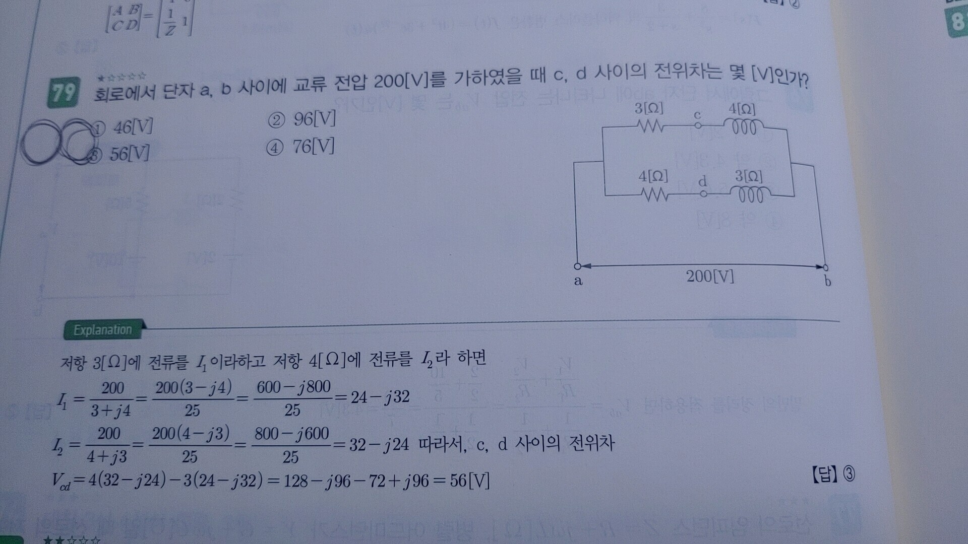 c점의 전위는 3옴에서 전압강하가 일어나고 난 다음 전위니 리액터 4옴에 걸리는 전압이라고 생각하는데 해설지에는 아랫단 Vd의 순저항 4옴으로 계산해서 전압강하가 일어나기 전으로 계산해놨네요..