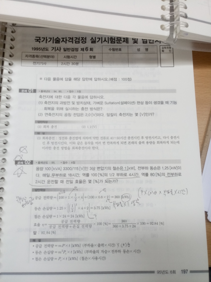 작성자로독불 작성시간 19.05.30 1. 철손은 부하 무부하 관계없이 철손x24시간이고 동손은 무부하는 0이고 전부하는 1자승X 동손 X가동시간, 1/2부하는 (1/2)자승X동손X가동시간 위문제에서 2는 전부하시간으로 1자승x동손X2시간을 나타내것임 동손1.25는 공통으로 앞으로 빼낸것임