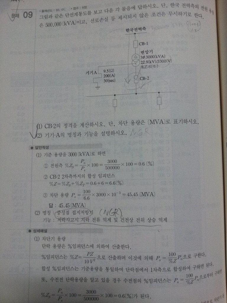 이 문제 (1)번에서 차단기 차단용량 구하는거인데 해설에 나와있는식 말고
