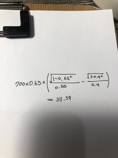 700*0.65*(루트(1-0.65^2)/0.65)- 700*0.9*(루트(1-0.9^2)/0.9)로 풀어야합니당 -