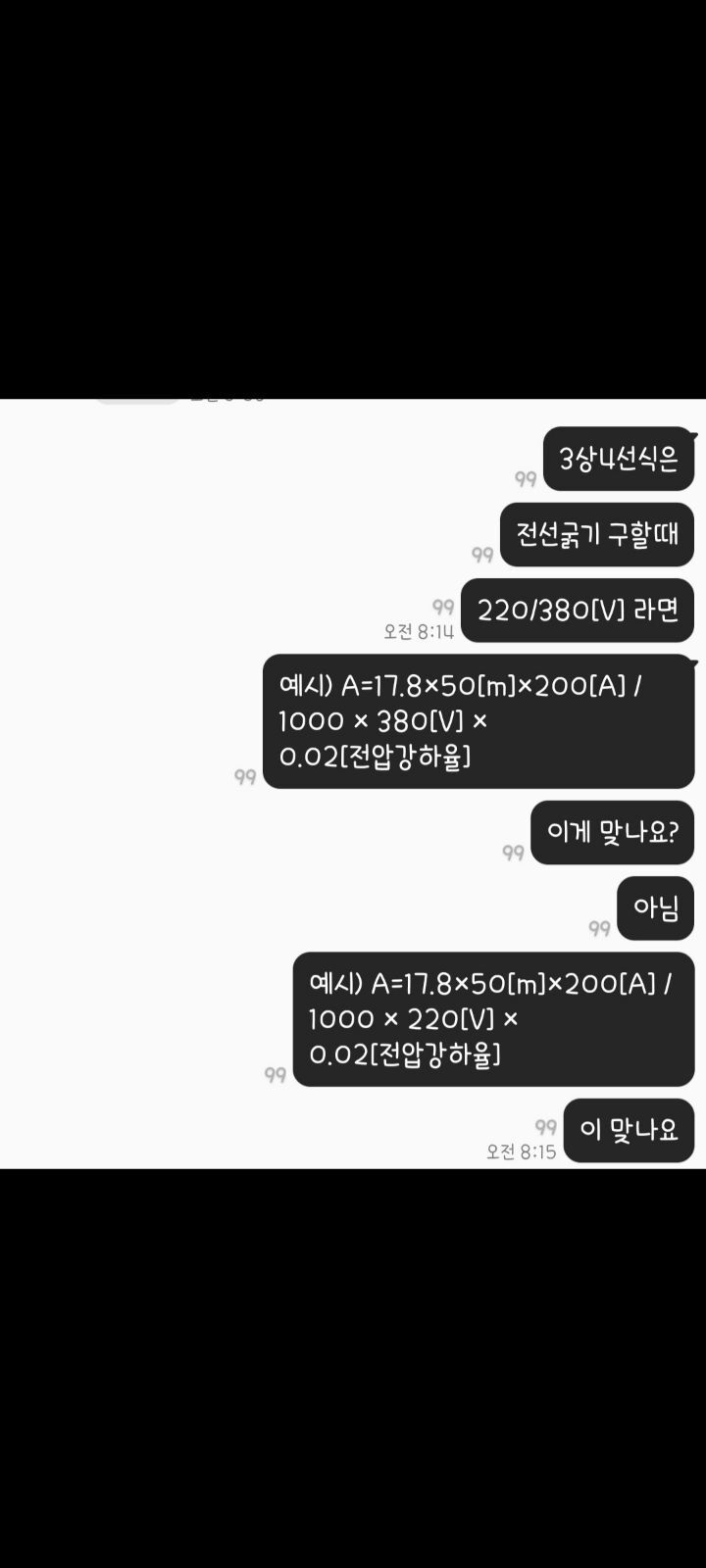 작성자잃어버린세대 작성시간 21.12.30 가운데꺼 A=17.8*루트3=30.8 구리 고유저항과 퍼센트도전율 적용하면 30.8로 되면 둘다 맞는거 같습니다.중간꺼 혹시 30.8아닌가요?. 그러면 먼저꺼는 3상4선식을 선간을 적용한 식인 것이고 아래꺼는 17.8에 허용전압강하 상전압을 적용한 것입니다.즉 3상4선식에서 전압강하 380V에 고유저항과 퍼센트도전율을 30.8로 적용하면 전압강하를 선간전압을 적용하고 아래꺼 처럼 3상4선식이라고 하더라도 17.8을 적용하면 평형시 중성선에서는 전류가 흐르지 않으므로 220v 로 전압강하를 적용하심이 맞을 듯합니다
