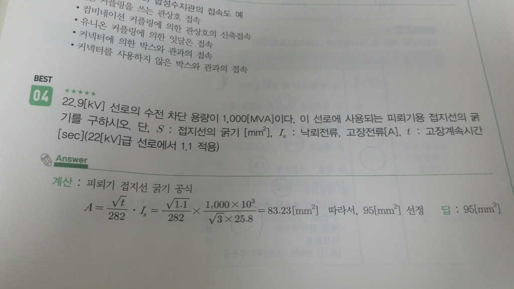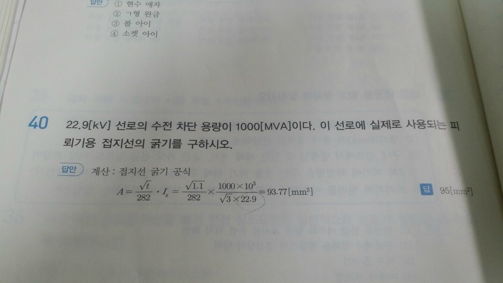 피뢰기용 접지선 굵기 선정문제좀 알려주세요 작성자이재홍|작성시간16.06.19|조회수4,095 목록 댓글 4 글자크기 작게가 글자크기 크게가 같은 문제인거 같은데 하나는 25.8 다른것은 22.9 를 했나요?? 다음검색 현재 게시글 추가 기능 열기 북마크 공유하기 신고 센터로 신고 댓글 댓글 4 댓글쓰기 답글쓰기 댓글 리스트 작성자하하히히하하 | 작성시간 16.06.19 차단용량 구할때 루트삼 곱하기 정격전압 곱하기 고장전류입니다따라서 v값은 정격전압을 넣어야 맞습니다~ 작성자용짱전기 | 작성시간 16.06.19 25.8 정답 작성자이재홍 작성자 본인 여부 작성자 | 작성시간 16.06.19 25.8 로 구해야 하는건가요?? 작성자에델바이스 | 작성시간 16.06.19 이 표를 참고하시기 바랍니다. 이미지 확대 댓글 전체보기