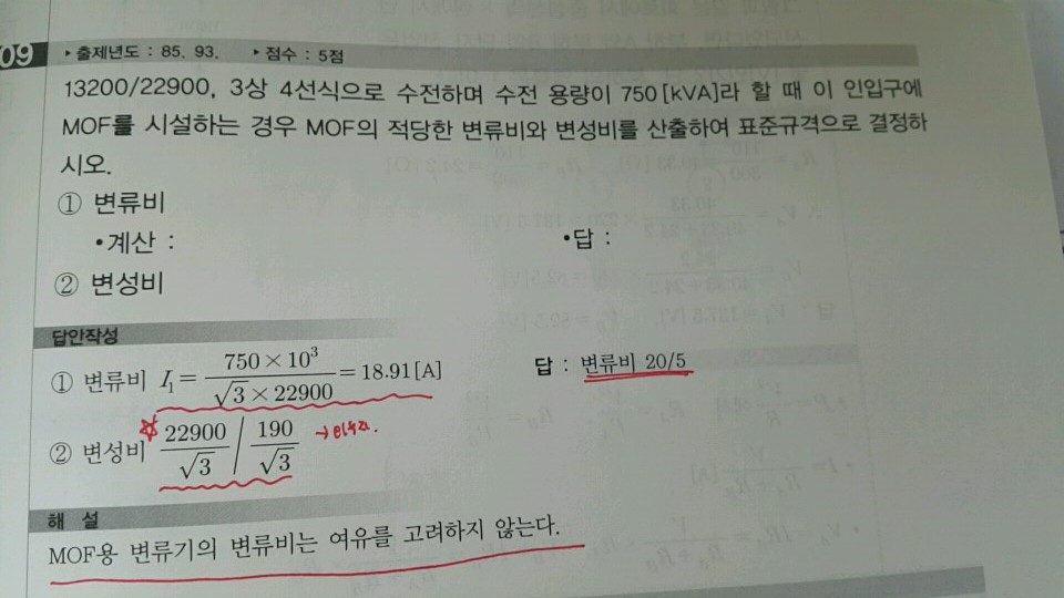 3상 3선식 회로에 MOF가 있다면 위 문제의 정격은 22900 / 190 이 될 것이고,