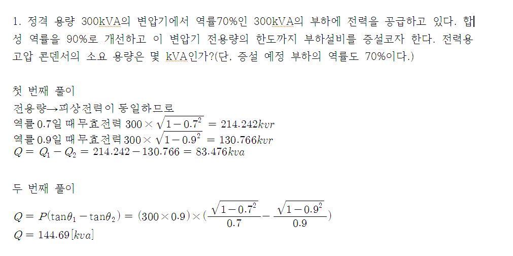답댓글 작성자아이라이니 작성자 본인 여부 작성자 작성시간 17.03.22 근자남편 감사합니다. 부하의개선전역률과같을때는 개선전부하에 증설용량을 더해준 후 개선해주고 // 개선전 개선후 역률과 완전다를때는 개선후를 구해주고 추가로 벡터합으로 역률이 완전다른 부하를 무효전력 따져서 계산해주고 //이렇게 정리를 해뒀는데요.. 개선후역률과 같을때는 어떻게 접근해야하지힌트좀 받을 수 있을까요?