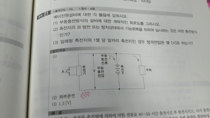 균등충전이 맞을까요 회복충전이 맞을까요 작성자옵이|작성시간17.10.25|조회수410 목록 댓글 1 글자크기 작게가 글자크기 크게가 균등이라는말도 있어서요 다음검색 현재 게시글 추가 기능 열기 북마크 공유하기 신고 센터로 신고 댓글 댓글 1 댓글쓰기 답글쓰기 댓글 리스트 작성자사시랑이 | 작성시간 17.10.26 안녕하세요...답변드립니다. 이 문제에서는 설페이션 현상과 관련없이 기능 회복이라고 하였기 때문에 회복충전이라고 답하시면 됩니다. 다만, 설페이션 현상에 의한 회복은...한전 기술용어집에 설페이션 현상에 대한 내용이 있으며, 이에 대해 균등충전이라고 되어 있습니다. 균등충전과 회복충전에 대한 논란이 많으며, 둘다 정답이 될수도 있으나, 한전기술 용어집의 내용에 따라 균등충전으로 답하고 있습니다. 댓글 전체보기