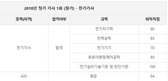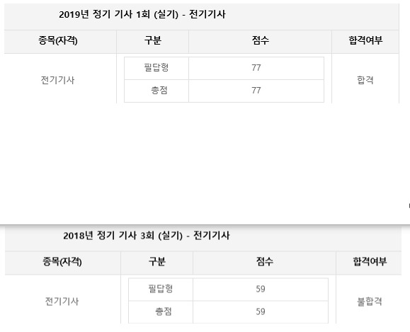 154에서 전기기능사 자격을 취득하고, 163때 전기산업기사 자격을 취득하게 되었습니다. 그 후 백화점에 시설관리직으로 일을 시작하게 되었고 업무파악한다고 한동안 전기공부를 못하다가 17년 하반기부터 다산교재로 공부를 시작하여 181때 기사필기를 통과하고 183에서 첫번째 실기시험을 봤는데 59점으로 실패하고 191때 77점으로 최종합격하였습니다. 사진에 첨부된 점수는 다산에 가입한 이후 거둔 성적표입니다.