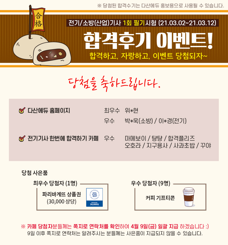 [당첨발표] 2021년 1회 전기/소방 (산업)기사 필기 합격후기 이벤트! 작성자다산에듀|작성시간21.04.06|조회수233 목록 댓글 3 글자크기 작게가 글자크기 크게가 다음검색 현재 게시글 추가 기능 열기 북마크 공유하기 신고 센터로 신고 댓글 댓글 3 댓글쓰기 답글쓰기 댓글 리스트 작성자성공은 내꺼 | 작성시간 21.04.25 당첨 되신분들 축하드려요 작성자도전하는 삶이 아름답다 | 작성시간 21.05.17 축하합니다 좋겠당~~~ 작성자블랙커피 | 작성시간 21.11.19 축하드립니다^^ 댓글 전체보기