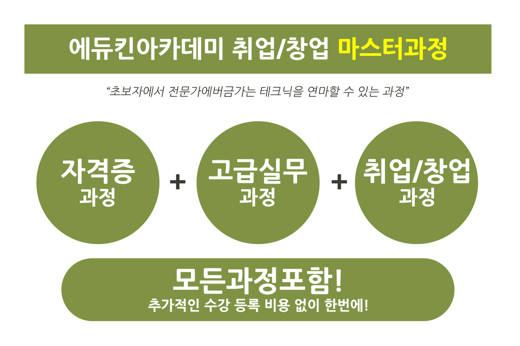 취업/창업 마스터프로그램은 국가자격증 취득 뿐 아니라, 취업과 창업에 필요한 고급실무교육과 취업/창업에 아주 실질적인 도움이 되는 취업/창업특강까지 이 모든 과정에 대한 교육이 가능합니다. 매우 합리적인 금액이기도 하고, 정말 실속있게 구성되어 있는 과정이죠. 이미 에듀킨 수강생의 80%이상이 마스터과정을 통해 취업과 창업을 알차게 준비하고 있습니다.