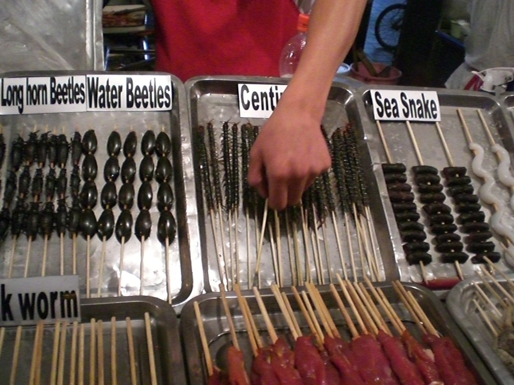 물방개, 지네, 전갈, 바다뱀 껍질, 하늘소 ,해마 , 번데기 , 애벌레 , 벌 ,불가사리 등 수많은 기묘한 꼬치를 팔죠.북경의 유명한 관광지입니다.수많은 외국인들이 신기해 하면서 관광하는 곳이죠.가끔 용기 있는 백인들이 전갈 등을 try 하는 진풍경도 봅니다.