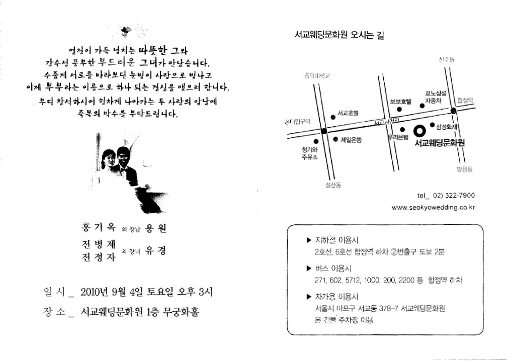 [[공지]]00학번 서용원 결혼 (9월 4일 토요일) 작성자파스지토|작성시간10.08.25|조회수132 목록 댓글 3 글자크기 작게가 글자크기 크게가 9월 4일 토요일 오후 3시에 용원이형 결혼식입니다. 축하해주세요. 첨부파일첨부된 파일이 2개 있습니다. pdf 파일 용형청첩장.pdf 다운로드 jpg 파일 용형청첩장.jpg 다운로드 다음검색 현재 게시글 추가 기능 열기 북마크 공유하기 신고 센터로 신고 댓글 댓글 3 댓글쓰기 답글쓰기 댓글 리스트 작성자박철우™ | 작성시간 10.08.25 잘 도....니가 올리네 작성자병권 | 작성시간 10.08.26 축하드립니다! 철우형 곧 뒤를 이으시나요? ㅋㅋㅋ 작성자서담원 | 작성시간 11.03.08 축하드립니다~~~ 한번 뵙고 싶어요 ㅠㅠ 댓글 전체보기