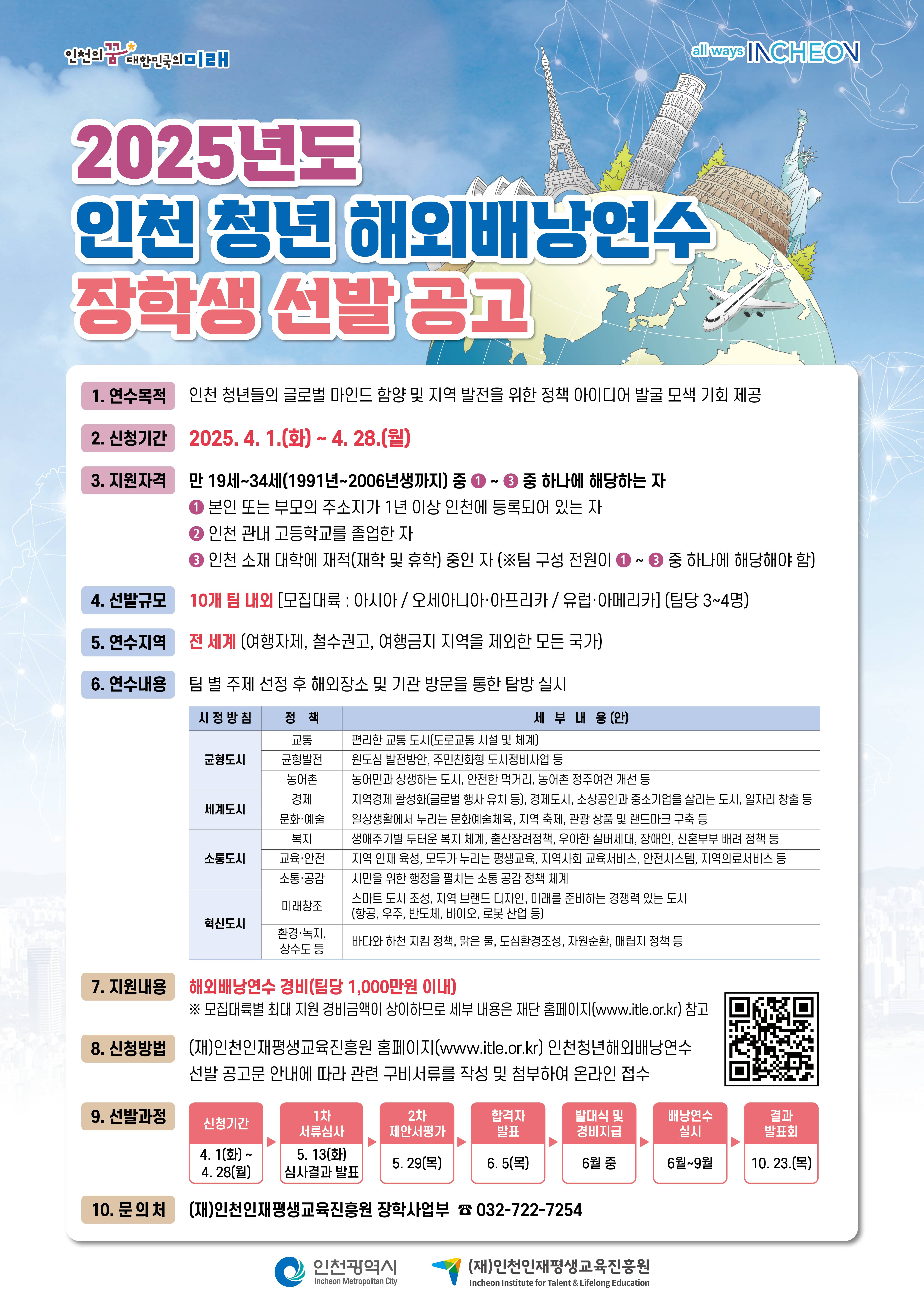 (재)인천인재평생교육진흥원「2025년 인천 청년 해외배낭연수」장학생 선발 안내